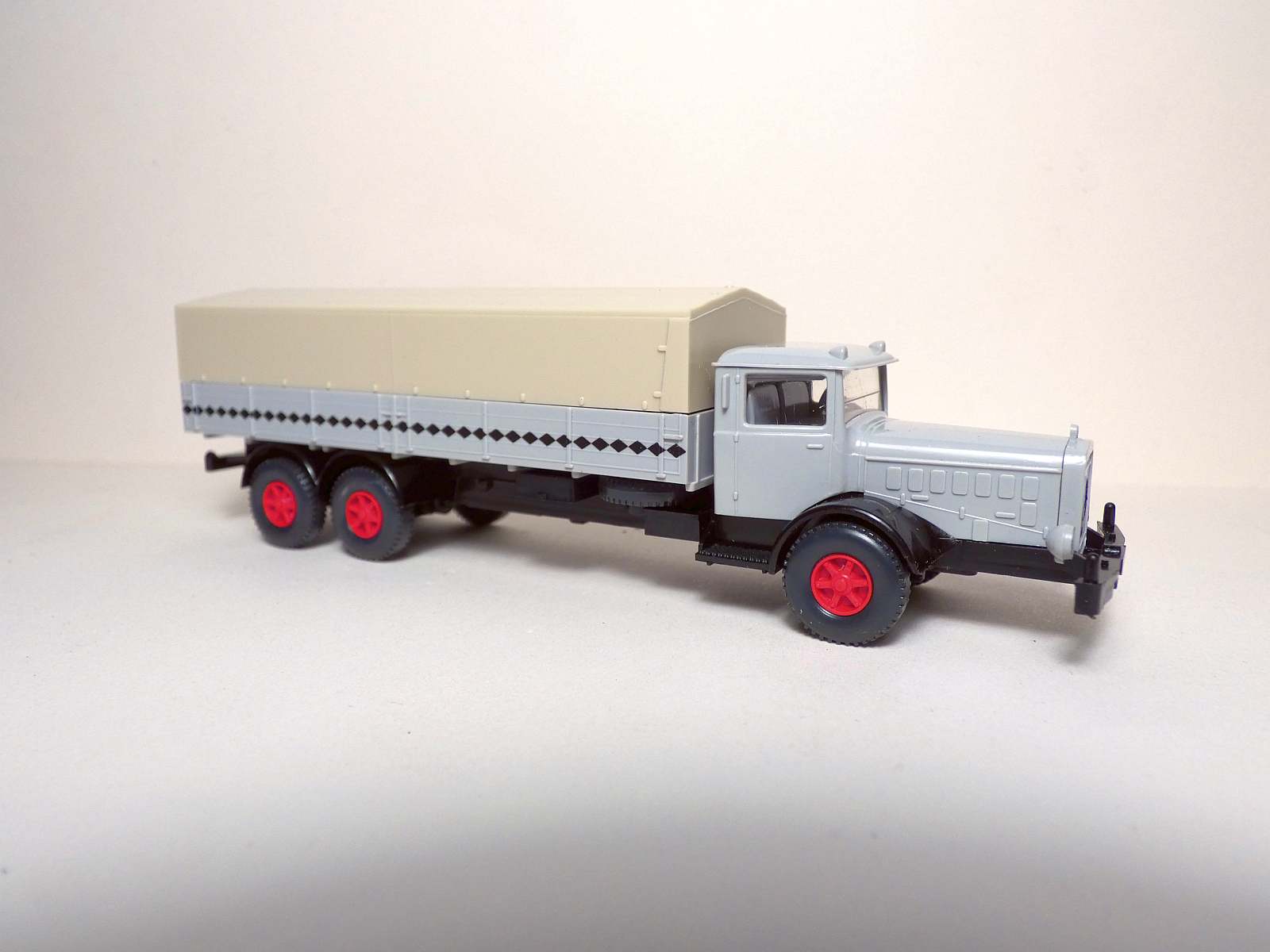 Chassis schwarz. Pritsche mit rautenförmigen Zierstreifen
