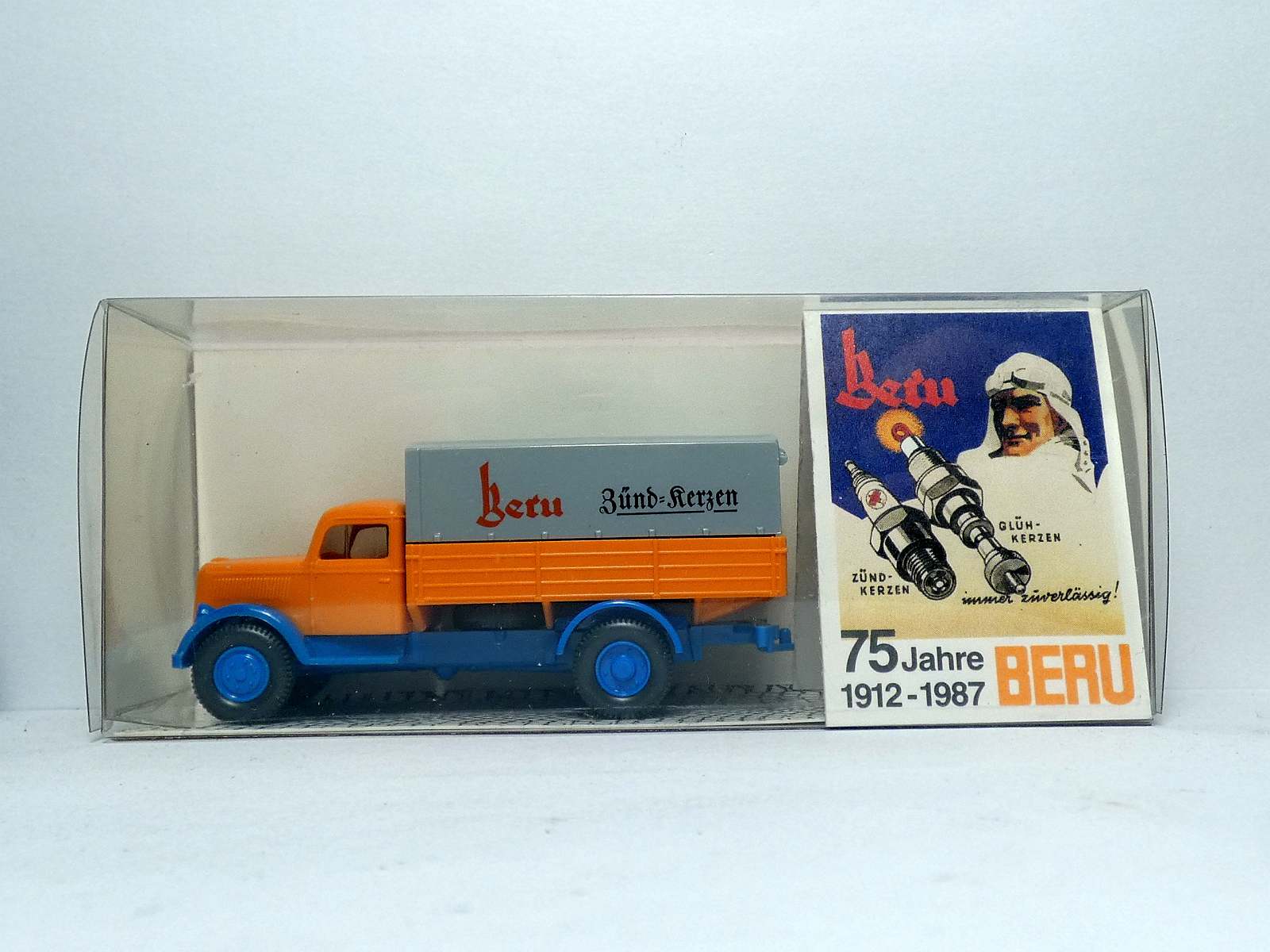 Beru Zünd-Kerzen, Führerhaus rotorange, Pritsche rotorange, Chassis lichtblau, Schrift „Zünd-Kerzen“, in Werbeschachtel